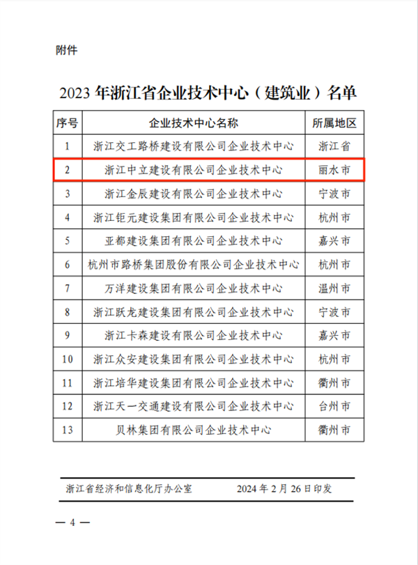 近日,浙江省經(jīng)濟(jì)和信息化廳等五部門(mén)公布2023年建筑業(yè)領(lǐng)域浙江省企業(yè)技術(shù)中心名單的通知,我公司企業(yè)技術(shù)中心榮獲2023 年建筑業(yè)領(lǐng)域浙江省企業(yè)技術(shù)中心認(rèn)定。