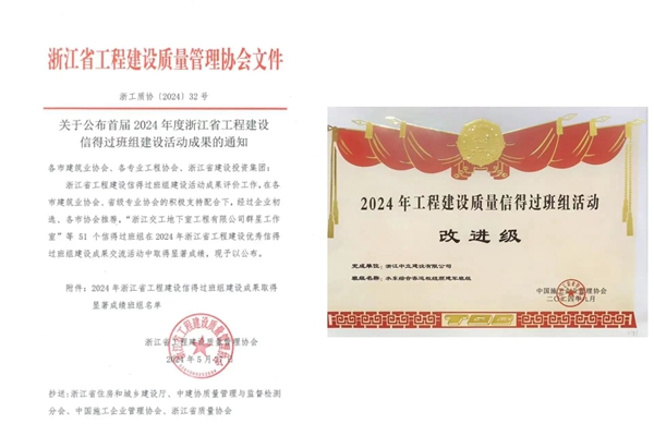 在2024年度工程建設(shè)質(zhì)量信得過班組比賽中,我公司水東樞紐項目團隊獲得浙江省建設(shè)成果取得顯著成績班組和中國施工企業(yè)管理協(xié)會《2024年度工程建設(shè)質(zhì)量信得過班組改進級》。