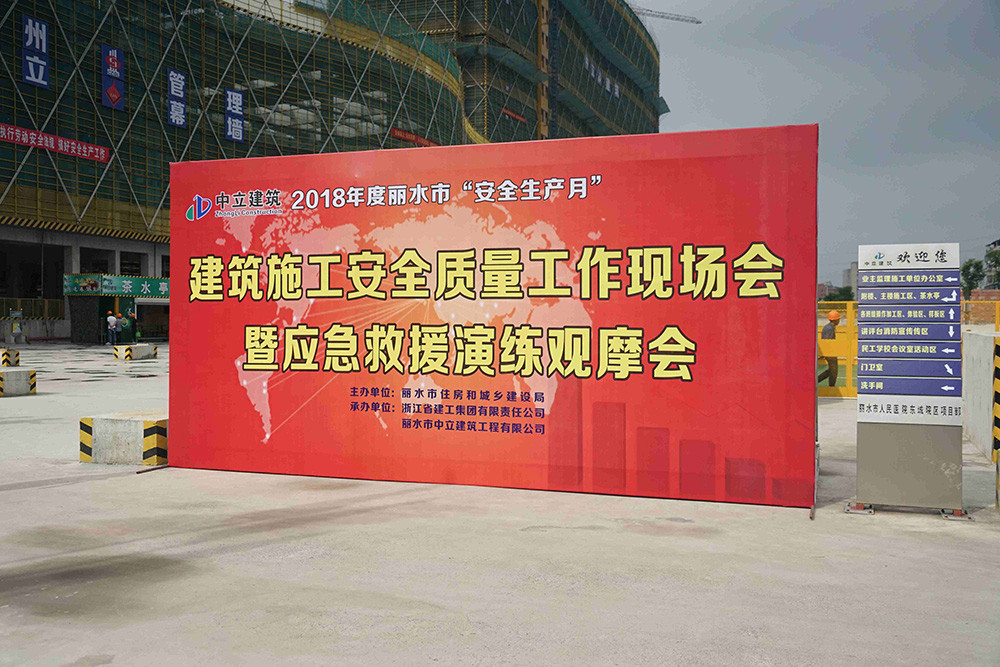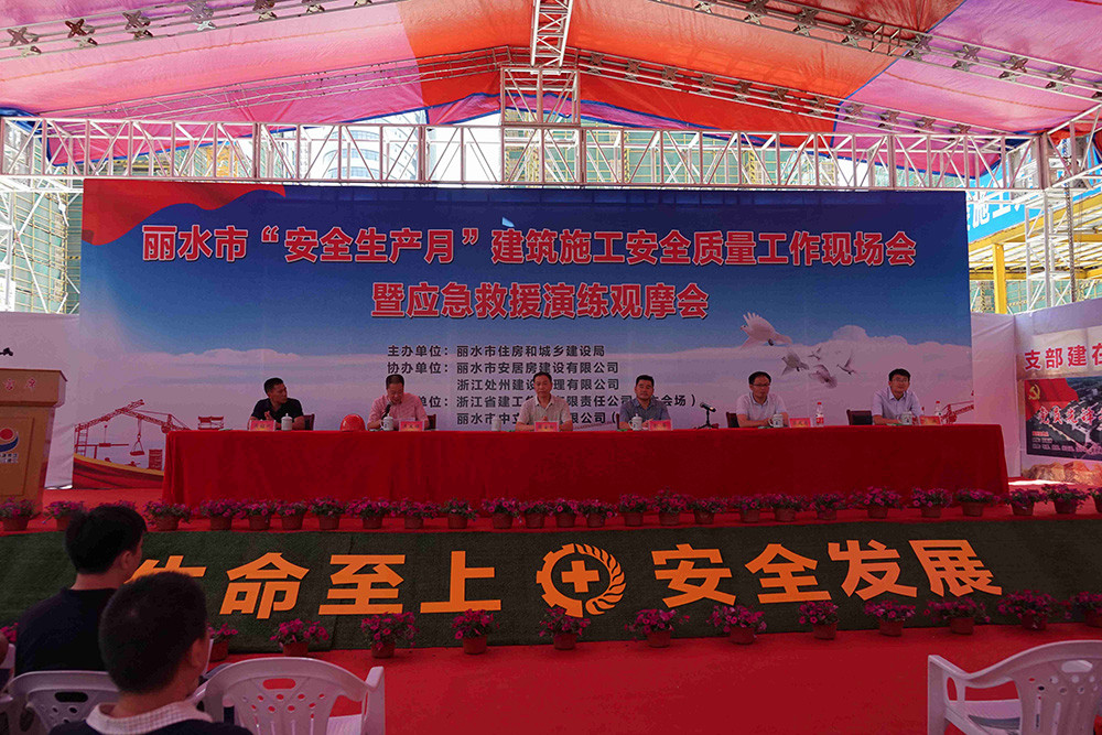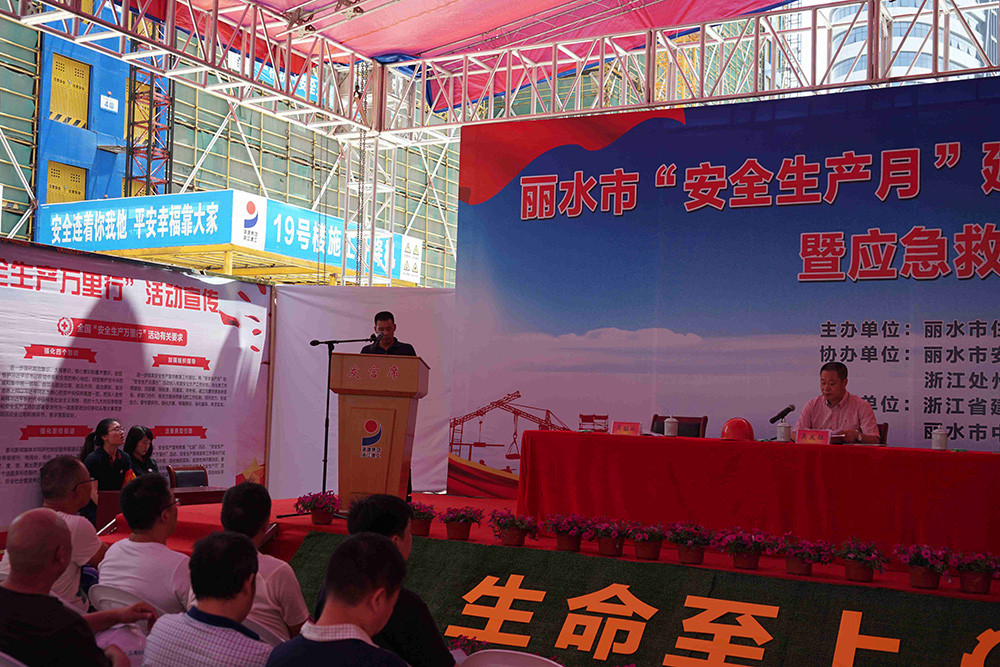 6月15日上午,麗水市住房和城鄉建設局召開麗水市“安全生產月”建筑施工安全質量工作現場會暨應急救援演練觀摩會,我公司承建的麗水市人民醫院東城院區項目部為本次會議的觀摩現場、公司副總經理吳韶斌代表施工單位在大會上作交流發言。
